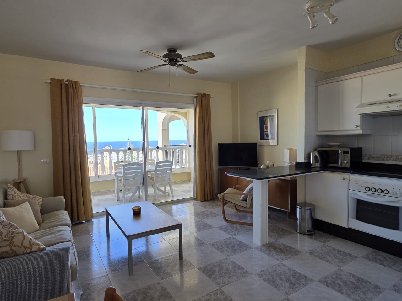 Second floor, one bed apartment with enclosed terrace. Good ocean and golf course views.